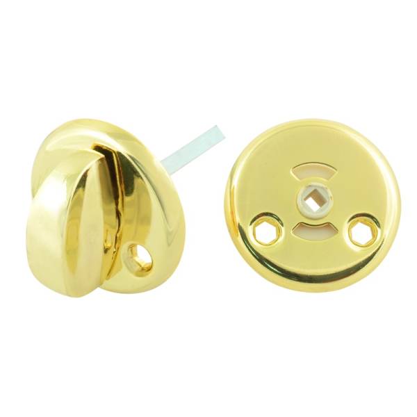 Металлическая поворотная кнопка окрашенная в золото, также называется сантехнической поворотной ручкой, устанавливается вместе с защелкой на легкие межкомнатные двери, двери санузлов.