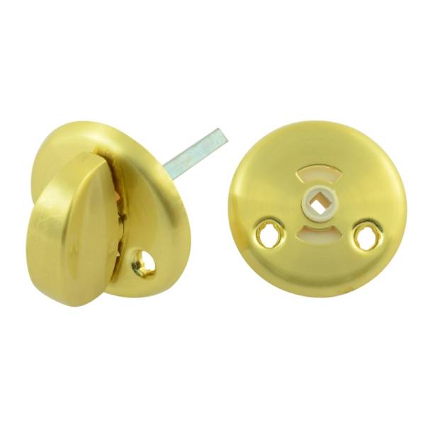Металлическая поворотная кнопка окрашенная в золото, также называется сантехнической поворотной ручкой, устанавливается вместе с защелкой на легкие межкомнатные двери, двери санузлов.