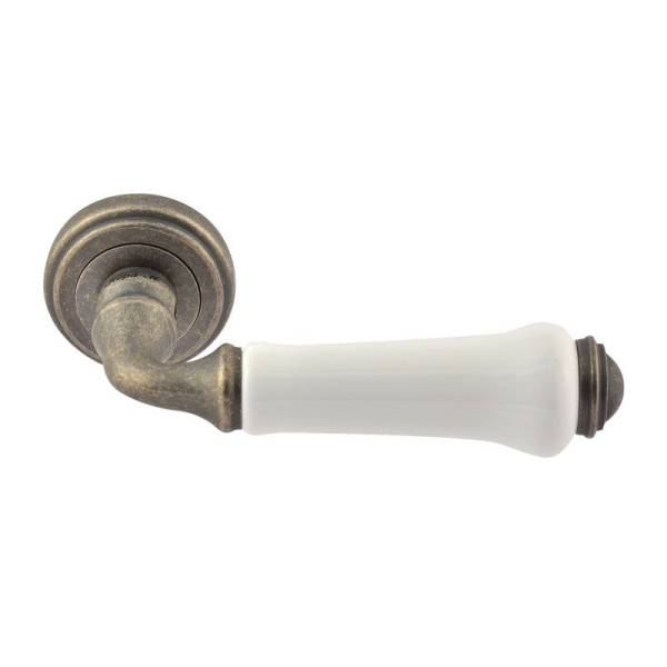 Ручка дверная Нора-М Андалусия J на розетке для деревянных и металлических дверей белый фарфор застаренное серебро.