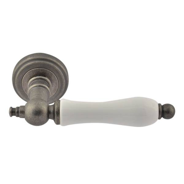 Ручка дверная Нора-М Каталония J на розетке для деревянных и металлических дверей белый фарфор застаренное серебро.