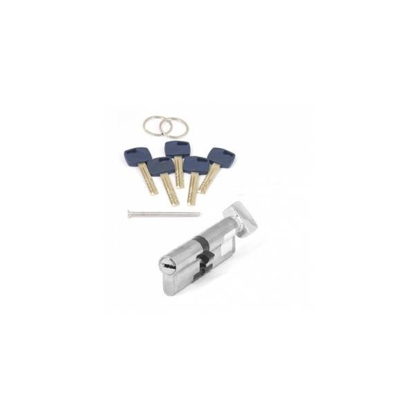 Технические характеристики: Размер цилиндра 100 мм, смещение 45х55 мм, модификация ключ-вертушка, вертушка с меньшей стороны (со стороны 45 мм), материал цилиндра латунь, покрытие гальваническое, цвет покрытия никель, перфорированный (лазерный) ключ, в комплекте 5 ключей.