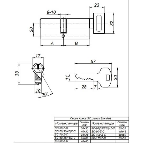 Механизм цилиндровый APECS SC-90-C-NI 45х45 английский ключ-вертушка никель сертифицирован на 2-й класс по ГОСТ Р 5089-2011.