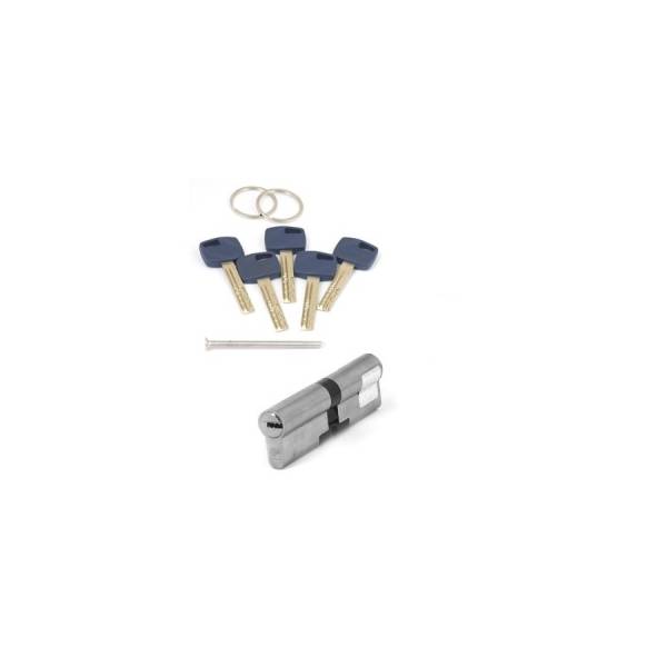 Технические характеристики: Размер цилиндра 100 мм, без смещения 50х50 мм, модификация ключ-ключ, материал цилиндра латунь, покрытие гальваническое, цвет покрытия никель, перфорированный (лазерный) ключ, в комплекте 5 ключей.