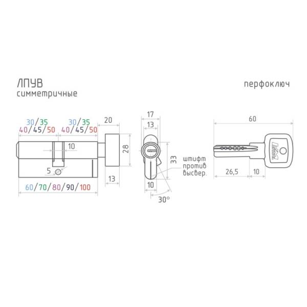 Размеры цилиндров серии ЛПУВ Нора-М: 60 мм 30х30в; 70 мм 35х35в, 30вх40; 80 мм 40х40в, 35вх45; 90 мм 45х45в, 40вх50.
