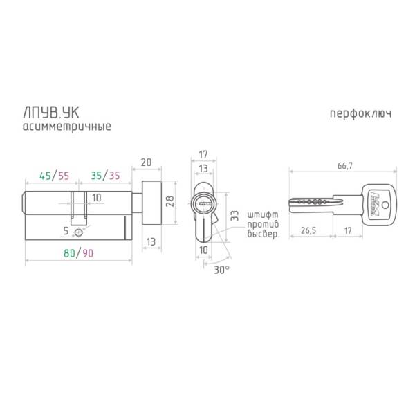 Размеры цилиндров ЛПУВ.УК-80: общая длина 80 мм, сторона ключа 45 мм, со стороны вертушки 35 мм (от края цилиндра до центра отверстия под винт).