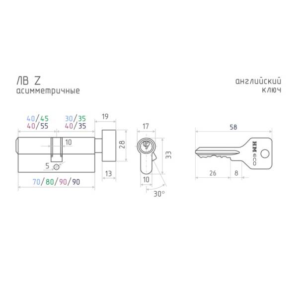 Технические характеристики ЛВ-80 ECO Z (45-35): материал корпуса - сплав ЦАМ; Сердечник и корпус изготовлены из сплава ЦАМ. Тип механизма - ассимметричный; размер сторон 45х35, вертушка со стороны 35 мм; количество пинов 6; циклы наработки не менее 12 тыс. Пятислойное гальваническое покрытие. Цвет покрытия хром. В комплекте 5 стальных английских ключей. Гарантия от производителя на цилиндры серии ECO Z - 1 год.