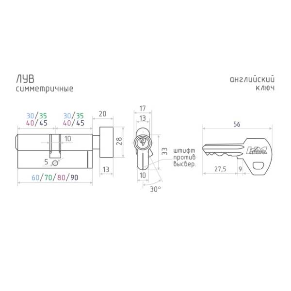 Размеры цилиндров серии "ЛУВ" Нора-М: 60 мм 30х30в; 70 мм 35х35в, 30вх40; 80 мм 40х40в, 35вх45, 30вх50; 90 мм 45х45в, 40вх50.