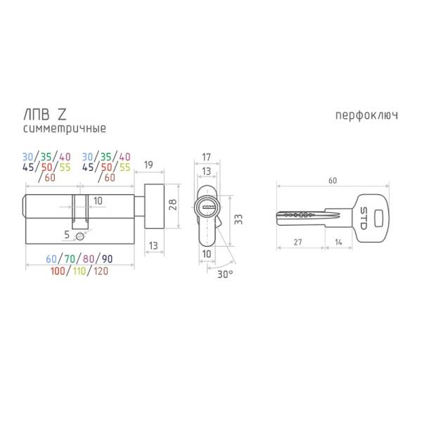 Размер МЦ Z ЛП-100: общая длина цилиндра 100 мм, симметричный 50х50 мм. Модификация ключ-вертушка