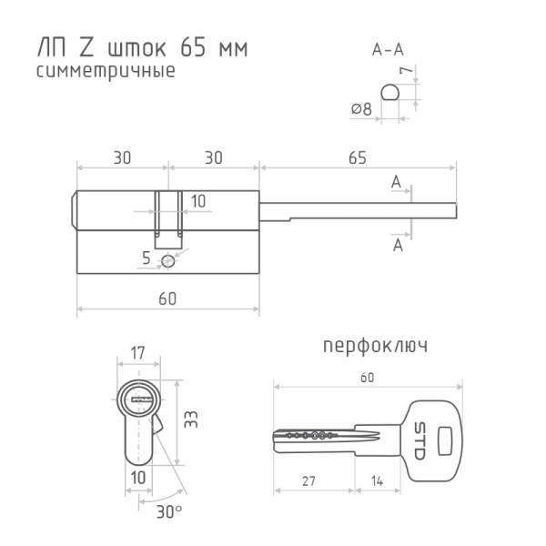 Механизм цилиндровый STD Z ЛП со штоком лп-60 (30-30) хром