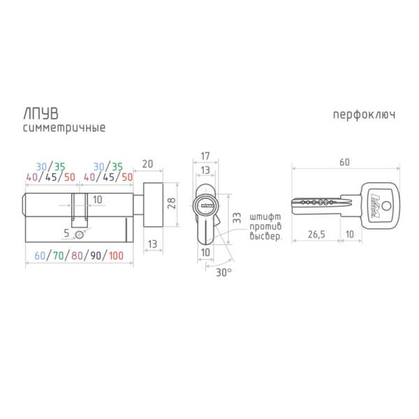 Размеры цилиндров ЛПУВ-60: общая длина 60 мм, сторона ключа 30 мм, со стороны вертушки 30 мм (от края цилиндра до центра отверстия под винт).