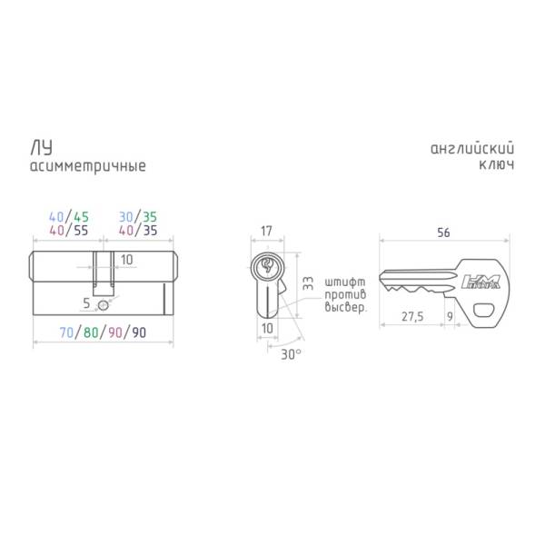 Технические характеристики МЦ ЛУ-90 (35х55) Нора-М: материал цилиндра латунь; тип механизма ассимметричный; тип ключа английский; количество пинов 5; штифт против высверливания отсутствует; общая длина цилиндра 90 мм, со смещением 35х55 мм, т.е. язычок находится не по центру, а смещен на 15 мм.