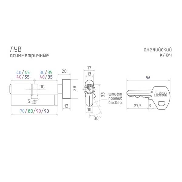 Размеры цилиндров ЛУВ-90: общая длина 90 мм, сторона ключа 55 мм, со стороны вертушки 35 мм - от края цилиндра до центра отверстия под винт.