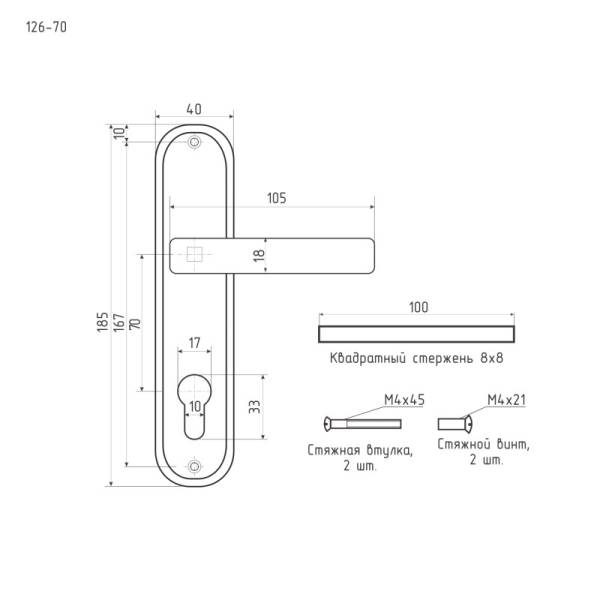 Межосевое расстояние 70 мм. Высота планки 185 мм, ширина планки 40 мм. Длина ручки 105 мм.
