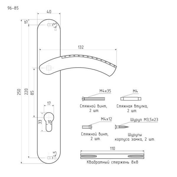 Межосевое расстояние 85 мм. Высота планки 250 мм, ширина планки 40 мм. Длина ручки 134 мм.