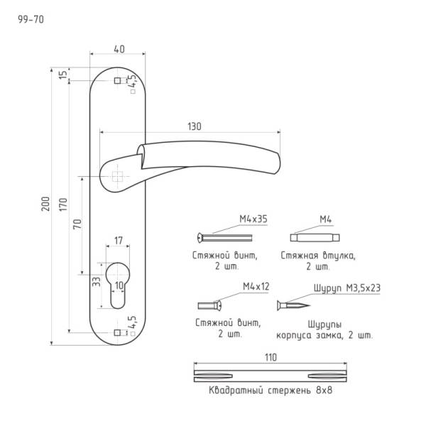 Дверная ручка на планке модели 99 -70 мм комплектуется с замками под цилиндр с межосевым расстоянием 70 милиметров. Изготовлена из высококачественной стали.
