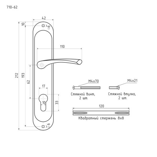 Дверная ручка на планке модели 710 -62 мм комплектуется с замками под цилиндр с межосевым расстоянием 62 милиметров. Изготовлена из высококачественной стали.