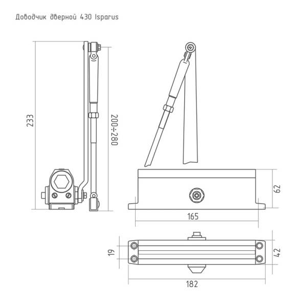 Габариты тела доводчика Нора-М ISP: 182х42х62 мм. Цвет доводчика серебро.