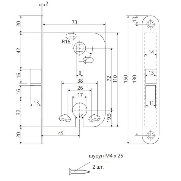 Удаление ключевого отверстия 45 мм, межосевое расстояние 72 мм, высота лицевой планки 150 мм, расстояние между крепежными овтерстиями 130 мм.