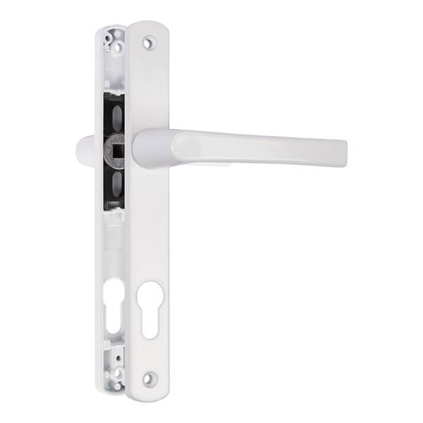 Конструкция подходит для узкопрофильных замков с межосевым расстоянием 85 мм и планкой 25 мм, а также для профиля толщиной 67-75 мм без укорачивания крепежа.