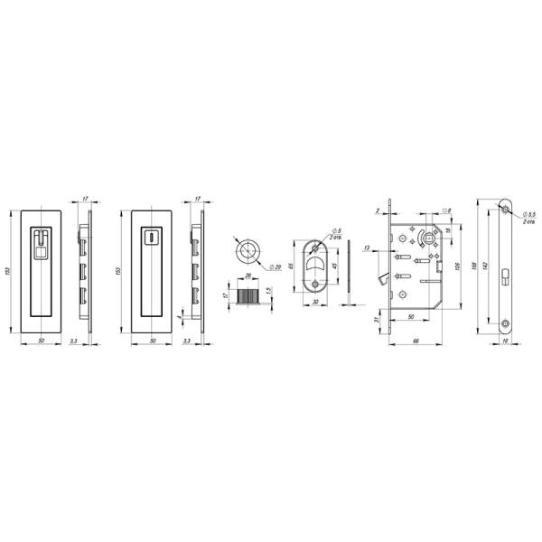 Высота торцевой планки корпуса защелки 168 мм, расстояние между крепежными отверстиями 142 мм.