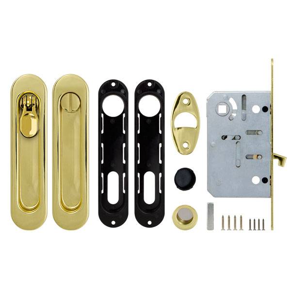 В комплект входит: ручки для раздвижных дверей, пластиковый вкладыш, торцевой захват, защелка для раздвижных дверей, ответная планка, крепежный комплект, шаблон для монтажа.