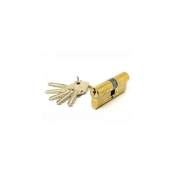Материал цилиндра - латунь. Цвет - золото. Тип ключа - английский. 5 пинов . Для замены сердцевины замка необходимо замерить расстояние от центра крепежного винта в обе стороны. Обязательно сообщить, имеется ли броненакладка. В случае, если с одной стороны цилиндра вертушок, следует указать, с какой именно с большей или меньшей.