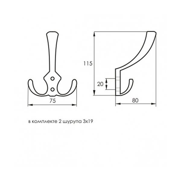 Технические характеристики: Материал изготовления крючка сталь. Количество рожков 3; Размер крючка-вешалки: высота 115, мм ширина 75 мм; глубина 80 мм. Материал изготовления сталь; Покрытие гальваническое; Цвет покрытия хром (серебро). В комплекте 2 шурупа 3х19.
