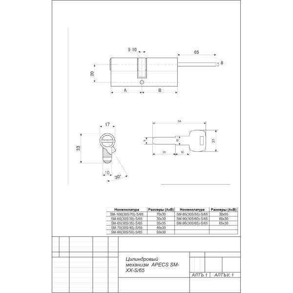 Механизм цилиндровый APECS SM-80(30S/50)-S/65-NI перфоключ шток со стороны 30 , 5 ключей в комплекте, цвет никель.