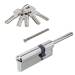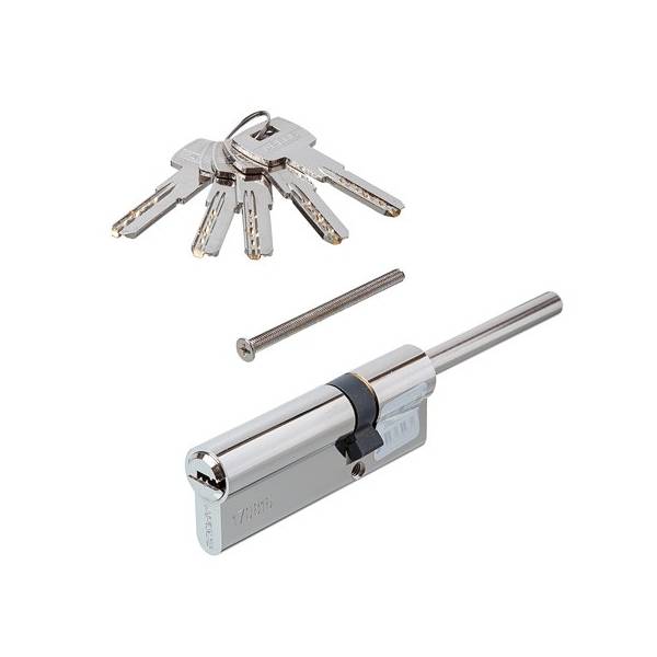Размер цилиндра 85 мм, смещение 55х30 мм, модификация ключ-шток, длина штока 65 мм, материал цилиндра латунь, покрытие гальваническое, цвет покрытия никель, перфорированный (лазерный) ключ, в комплекте 5 ключей.