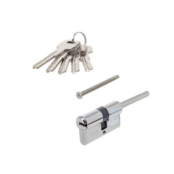 Размер цилиндра 60 мм, без смещения 30х30 мм, модификация ключ-шток, длина штока 65 мм, материал цилиндра латунь, покрытие гальваническое, цвет покрытия никель, перфорированный (лазерный) ключ, в комплекте 5 ключей.