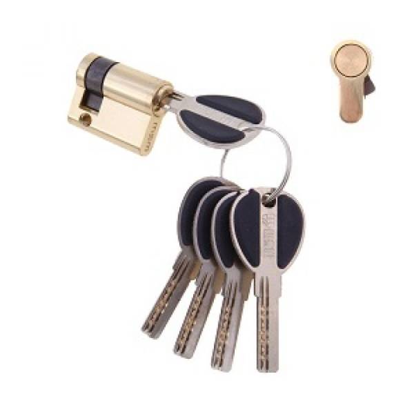 Технические характеристики: Латунный цилиндр с пятью перфорированными ключами . Размер цилиндра 40 мм, со смещением, 30х10 мм. Гальваническое покрытие, цвет покрытия золото.