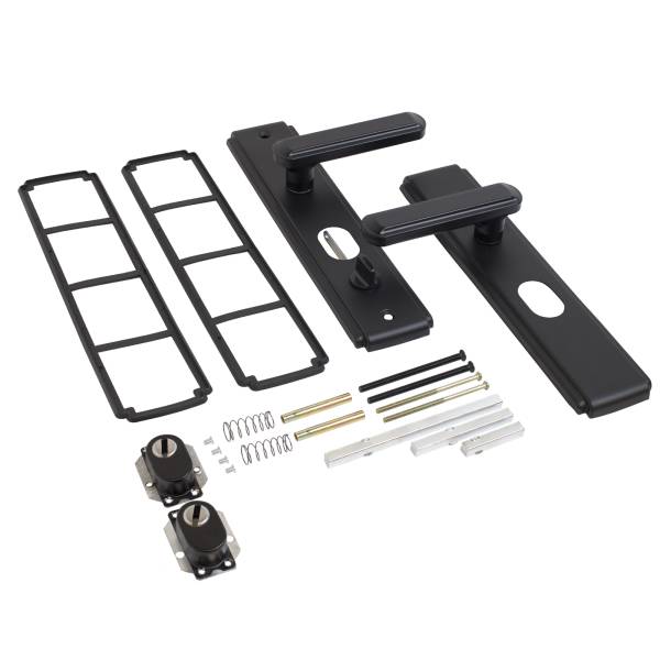 В комплект входят две ручки, винтовые стяжки, пластиковые прокладки и квадратный штырь (8х8 мм) 110 мм, комплекты стержней для автоматических и не автоматических замков.