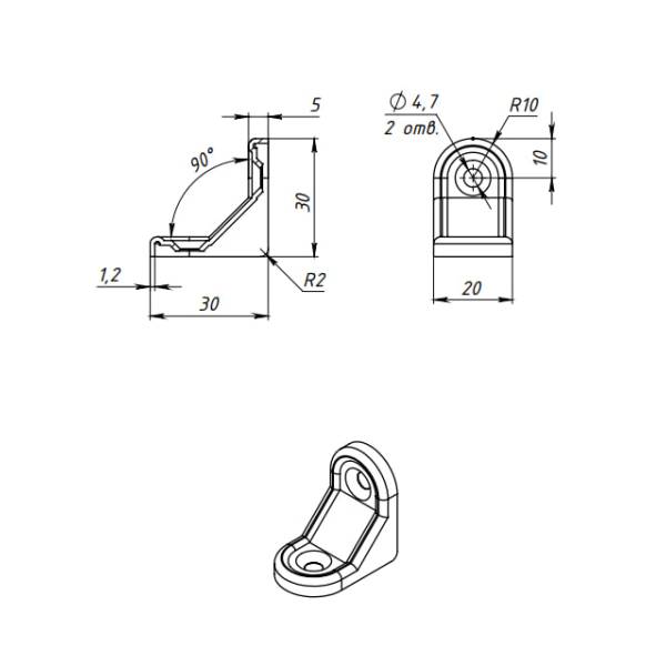 Данная модель металлического крепежного уголка с усиленной конфигурацией имеет размер 30 на 30 мм - длина каждой стороны изделия. Ширина изделия 20 мм. Толщина металла крепежного уголка 1,2 мм.