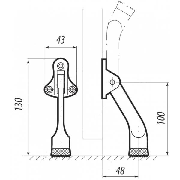Дверной ограничитель типа "козья ножка" позволяет застопорить дверь в любом открытом положении путем опускания фиксатора вниз.