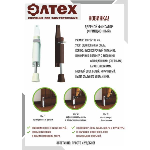 Дверной фиксатор ЭЛТЕХ позволяет экономить ресурсы работы двери и фурнитуры, а также не нарушает целостность стен и напольных покрытий (не нужно прикручивать к стене или полу). Принцип действия и дополнительные технические характеристики уточняйте у специалистов отдела продаж.