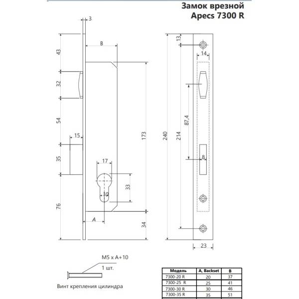 Технические характеристики модели Apecs ЗВ 7300-30-R: удаление ключевого отверстия (Backset) 30 мм; межосевое расстояние 85 мм; неавтоматическое запирание; дополнительный механизм секретности замка отсутствует; тип механизма секретности цилиндровый; роликовая защелка роликовая; вылет ригелей 16 мм; лицевая планка с гальваническим покрытием. Количество точек запирания 1. Цвет лицевой планки никель. Дополнительное запирание дверного замка изнутри отсутствует.