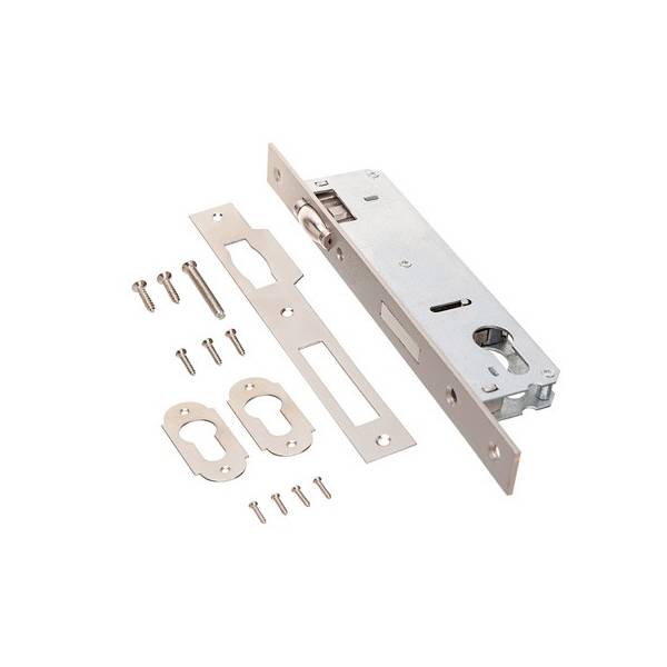 Врезной замок Apecs 7300-30-R-NI с роликом под ручку и цилиндровый механизм устанавливаются на узкопрофильные ПВХ двери.