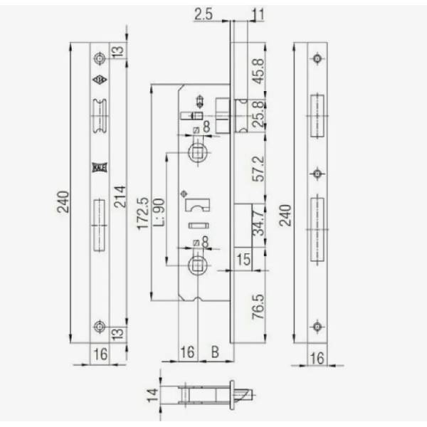 Технические характеристики: корпус врезного замка под фиксатор, межосевое расстояние 90 мм, удаление ключевого отверстия 35 мм. Ширина торцевой планки 16 мм.