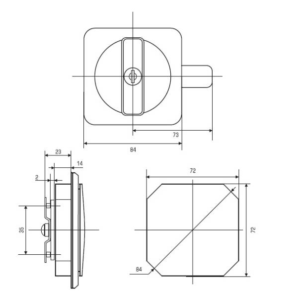 Внешний габариты замка-ручки: 84х84х15 мм (см. чертеж).