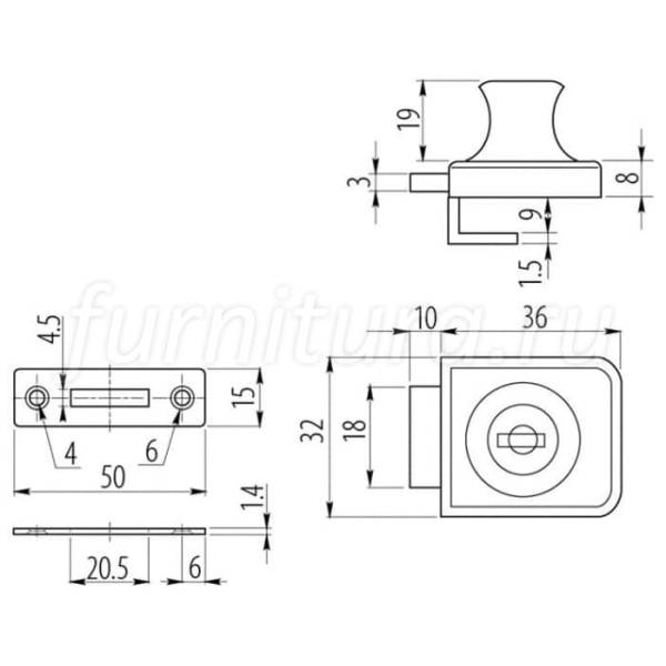 Замок №407 для стеклянных дверей закрывается поворотом ключа. При установке не требует просверливания стекла. Устанавливается на стеклянные дверцы толщиной 0,5-0,6 мм.