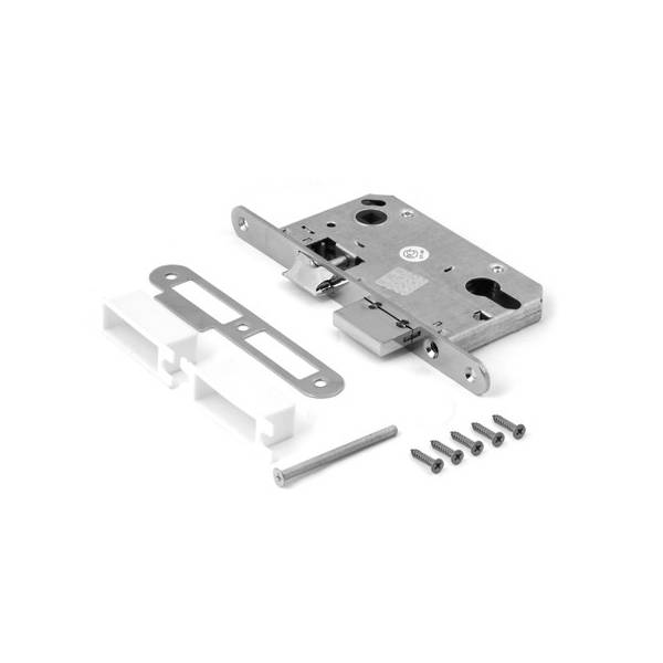 Корпус защелки устанавливается с дверными ручками на розетке, дополнительно комплектуется накладкой на цилиндр.