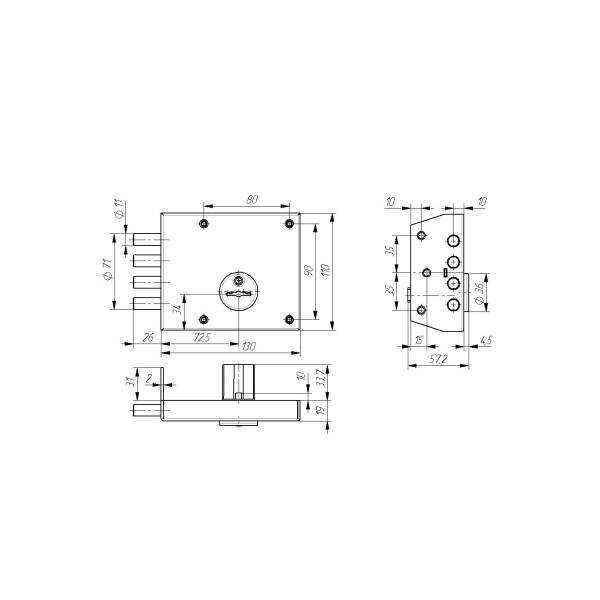 Замок имеет шесть сувальд, засов с тремя стержнями круглого сечения диаметром 11 мм, величина хода засова 26 мм.