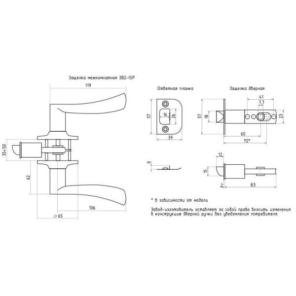 Технические характеристики ЗВ2-01 Нора-М; защелка для межкомнатных деревянных дверей, нажимная фалевая ручка, Бэксет 60-70 мм, Материал сплав алюминия / сталь, Материал механизма сталь, закаленная сталь,