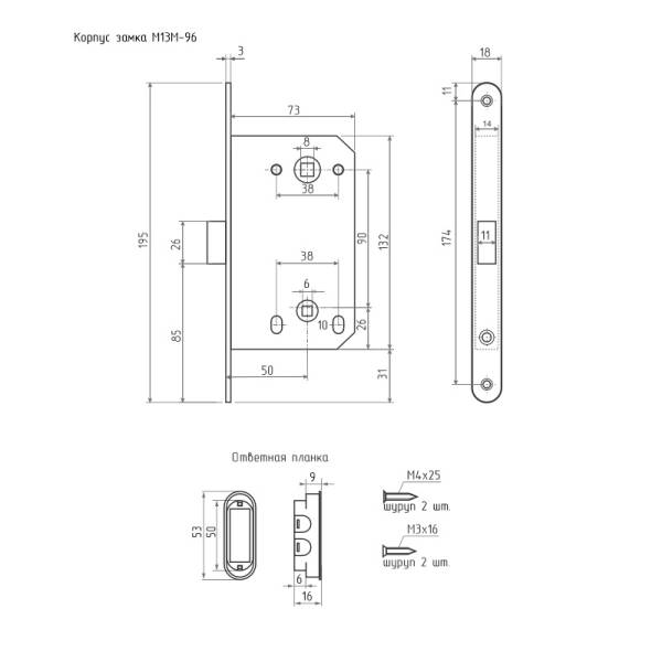 Корпус замка магнитный предназначается для установки на межкомнатные деревянные двери, в комплекте с ручкой на розетке и накладкой под фиксатор. Межосевое расстояние составляет 96 мм, расположение ригеля по центру. Размеры отверстий стандартные: под ручку 8х8 мм, под фиксатор 6х6 мм.