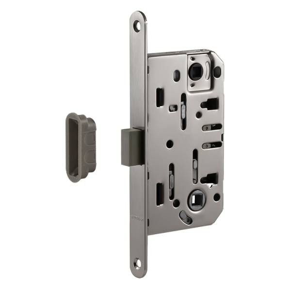 Корпус оснащен магнитным ригелем. При закрывании двери ригель с магнитным сердечником притягивается магнитом обратной полярности, расположенным в ответной планке. Открывание происходим посредством поворота ручки. Замок межкомнатный магнитный, укомплектованный таким корпусом, работает абсолютно бесшумно. Магнитный ригель не выступает за пределы дверного полотна, а потому корпус замка подходит для дверей как левого, так и правого открывания.