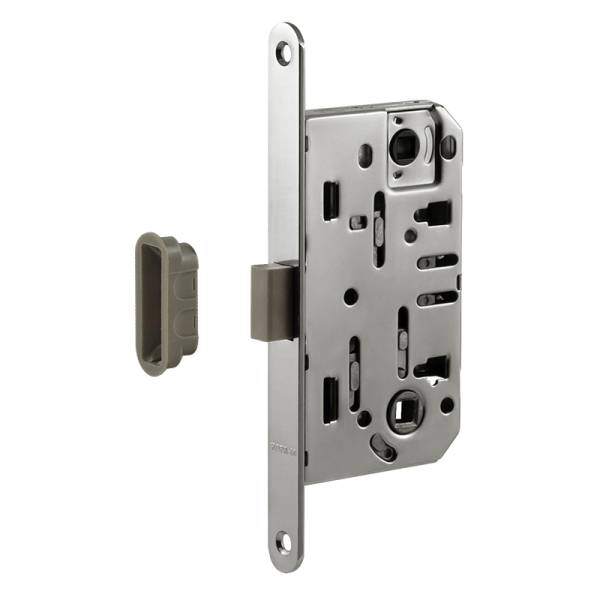 Корпус оснащен магнитным ригелем. При закрывании двери ригель с магнитным сердечником притягивается магнитом обратной полярности, расположенным в ответной планке. Открывание происходим посредством поворота ручки. Замок межкомнатный магнитный, укомплектованный таким корпусом, работает абсолютно бесшумно. Магнитный ригель не выступает за пределы дверного полотна, а потому корпус замка подходит для дверей как левого, так и правого открывания.