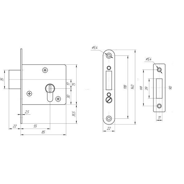 Замок врезной без ручки ЗВ1-2 (без механизма цилиндрового, корпус) Зенит. Замок врезной цилиндровый ЗЕНИТ предназначен для запирания деревянных дверей подсобных помещений и внутрених дверей квартир. Толщина полотна двери 40-55мм; Материал исполнения корпуса сталь; Цвет цинк; Удаление ключевого отверстия (Backset) 55 мм; Вид цилиндрового механизма двусторонний; Покрытие корпуса замка цинковое; Цвет лицевой и ответной планки белый цинк; Количество ригелей 1; Количество ключей 4; Тип ключа английский; Материал исполнения фурнитуры сталь; Покрытие фурнитуры цинковое; Количество секретных комбинаций не менее 15000; Величина выдвижения ригеля 22мм; Количество оборотов выдвижения ригеля 2.