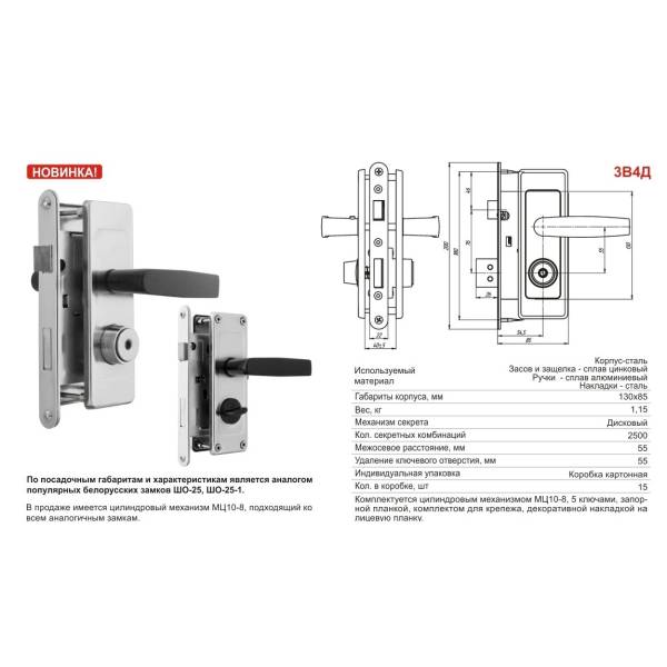 Замок врезной цилиндровый с защелкой и фалевыми ручками ЗЕНИТ, модель ЗВ4-3 ВАЗ (ДААЗ) предназначен для запирания входных деревянных и металлических дверей толщиной 40-55 мм.