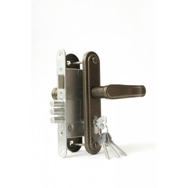 Замок ЗВ4-3 закрывается на засов и защелку, комплектуется двумя фалевыми ручками.