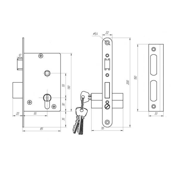 Замок врезной ЗВ4-3.03 (серебро) Зенит. Замок врезной цилиндровый с защелкой и фалевыми ручками ЗЕНИТ. Предназначен для запирания входных деревянных и металлических дверей. Закрывается на засов и защелку, комплектуется двумя фалевыми ручками. Цвет фурнитуры серебро; Толщина полотна двери 40-55мм; Материал исполнения корпуса сталь; Удаление ключевого отверстия (Backset) 55мм; Тип замка универсальный; Вид цилиндрового механизма двусторонний; Покрытие корпуса цинковое; Цвет лицевой и ответной планки белый цинк; Количество ригелей 1; Межосевое расстояние 55мм; Количество ключей 4; Тип ключа английский; Материал исполнения фурнитуры сплав алюминия; Покрытие фурнитуры полимерное; Длина цилиндрового механизма 70мм; Материал исполнения цилиндрового механизма силумин; Количество секретных комбинаций не менее 15000; Сечение отверстия под квадрат фалевых ручек 8 х 8мм; Величина выдвижения ригеля 22мм; Количество оборотов выдвижения ригеля 2.